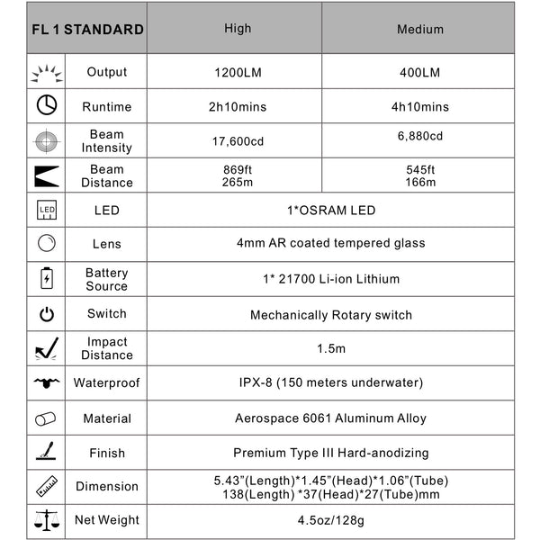 High (1200 lm): 2 hours 10 minutes - range 265 meters