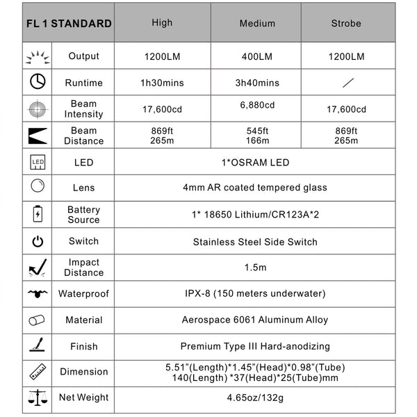 High (1200 lm): 1 hour 30 minutes - range 265 meters