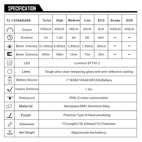 - 7 modes (turbo - high - medium - low - eco - strobe - SOS)