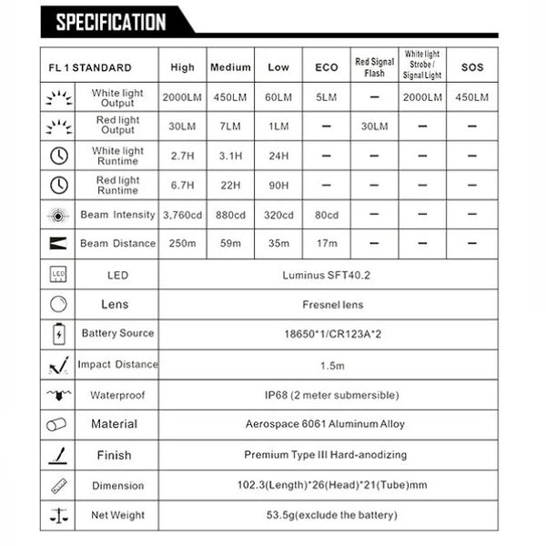 - 7 modes (high - medium - low - eco - strobe - red signal - SOS)